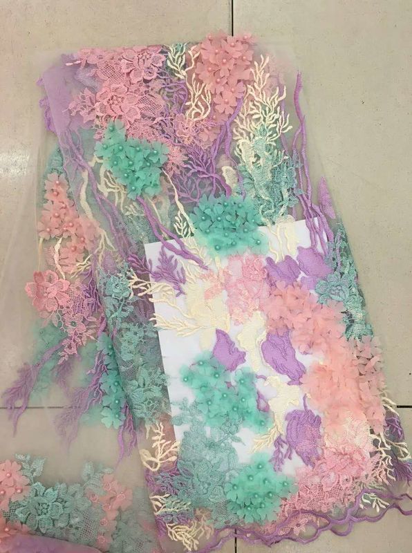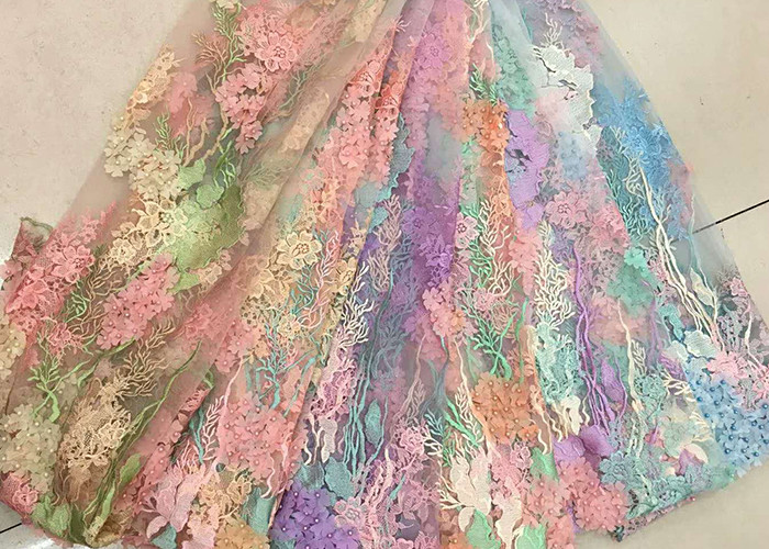 Ύφασμα δαντέλας με χάντρες 3D, Σκαλιστό πολύχρωμο κεντημένο ύφασμα με λουλούδια για φούστα